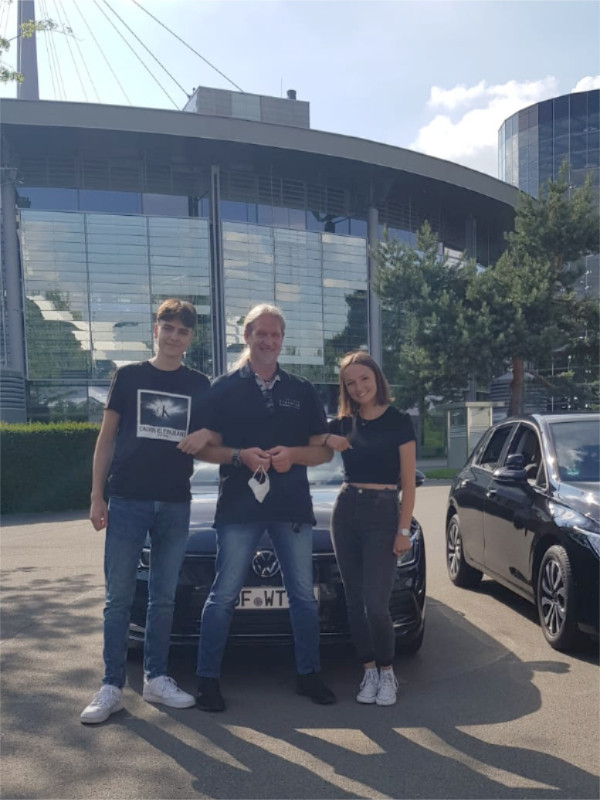Nach einer tollen Begrüßung und einem kleinen Rundgang durften wir dann gegen 16:30 Uhr unsere 4 neuen Golf 8 entgegennehmen. Für die Fahrschüler gab es noch ein schönes VW EM Trikot. Es war ein schönes Erlebnis, sich mal die Generationen der verschiedenen Autotypen anzuschauen. Anschließend ging es zur Pizzeria in die Autostadt, wo wir was leckeres essen konnten.